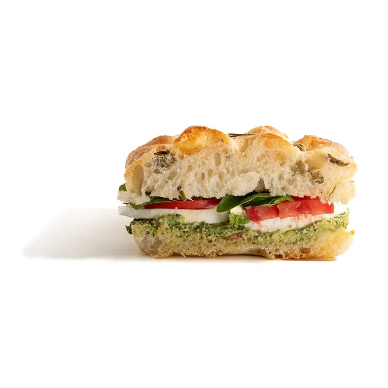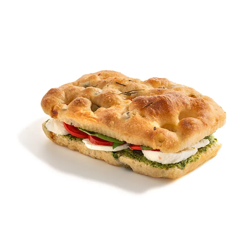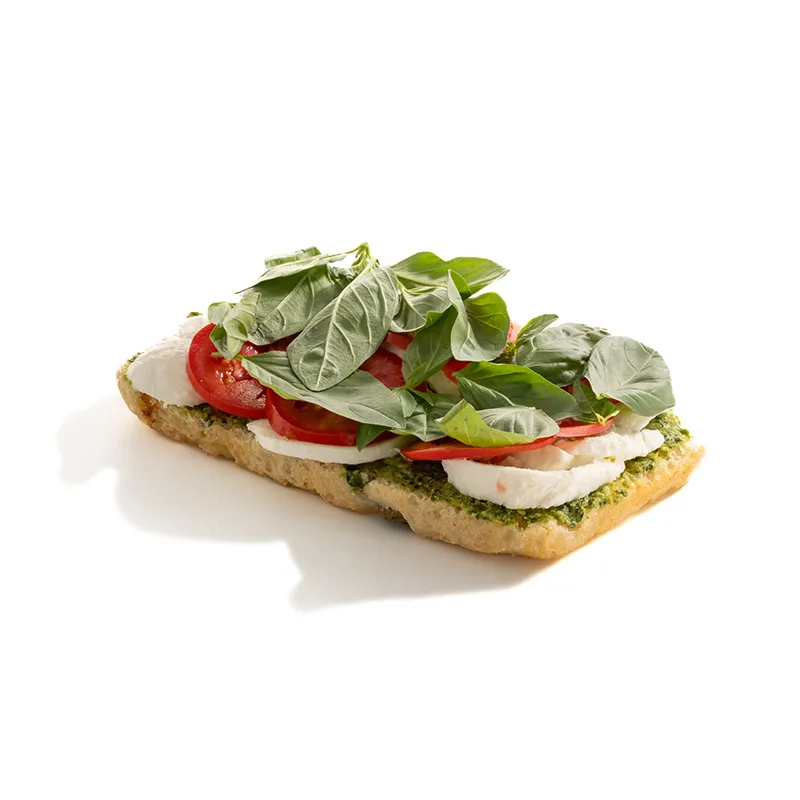 مناسب برای یک نفر ترکیبات: نان فوکاچیا ، سس پستو، گوجه، پنیر موزارلا، ریحان ایتالیایی